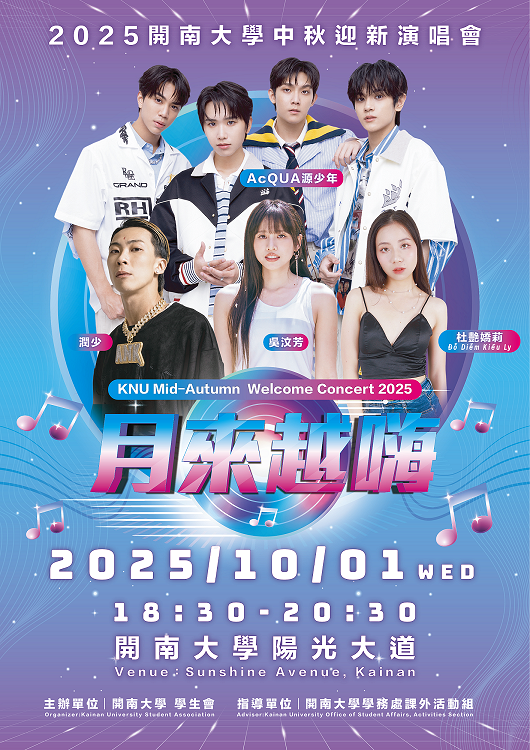 開南大學學生會將於114年10月01日星期三,晚上18:30~~21:00,於陽光大道舉辦「2025月來越嗨-中秋迎新演唱會」,在這個特別的夜晚!敬邀全校師生蒞臨,共同感受音符的魔力,並在這個音樂盛宴中找到屬於自己的快樂!