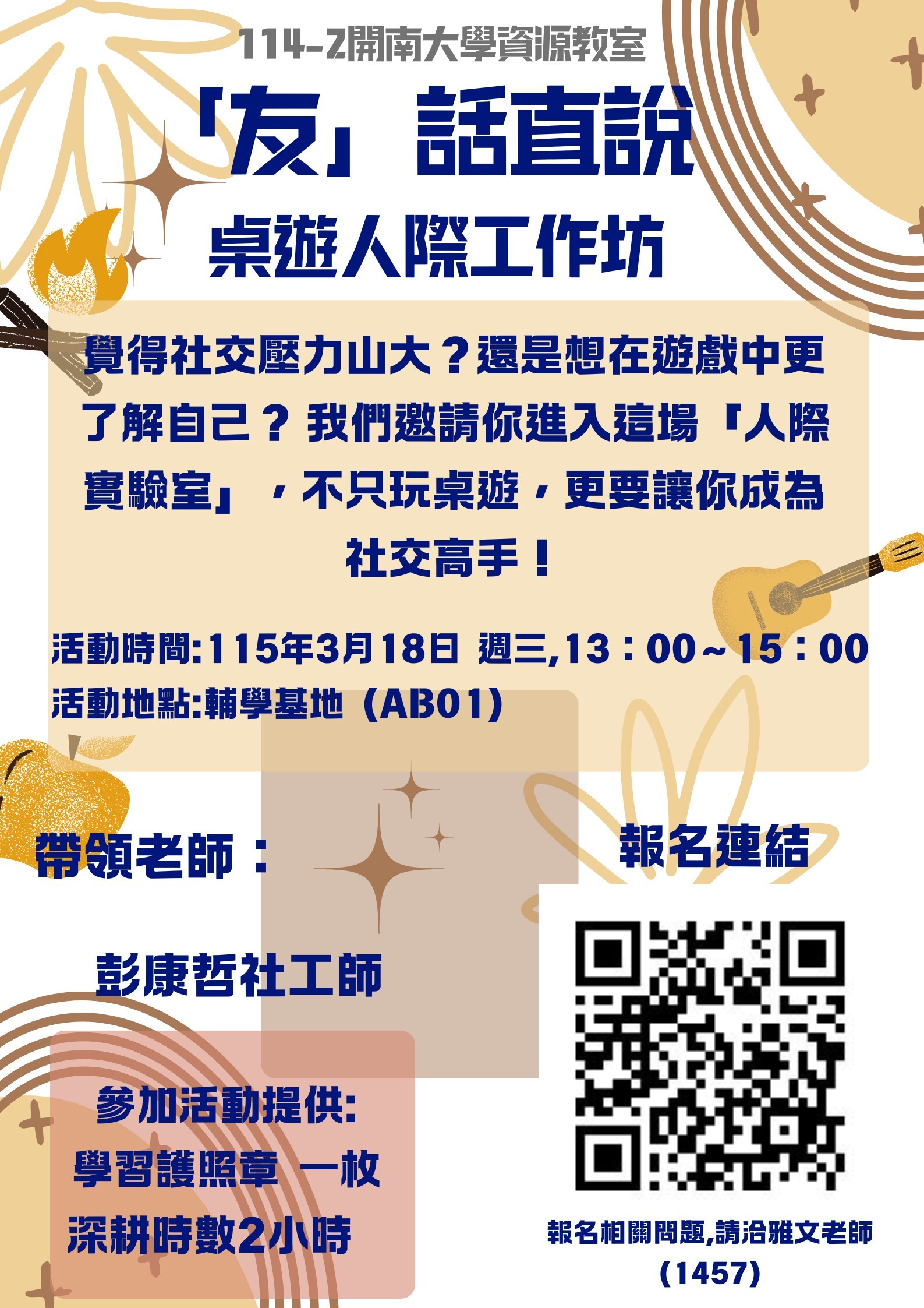 覺得社交壓力山大?還是想在遊戲中更了解自己? 我們邀請你進入這場「人際實驗室」,不只玩桌遊,更要讓你成為社交高手!這不僅僅是一場遊戲,而是一次專屬於你的社交超能力修煉。透過精選桌遊,我們將在輕鬆的氛圍中,一起探索溝通的奧秘,練習在壓力下保持優雅,並找到最適合自己的社交策略。